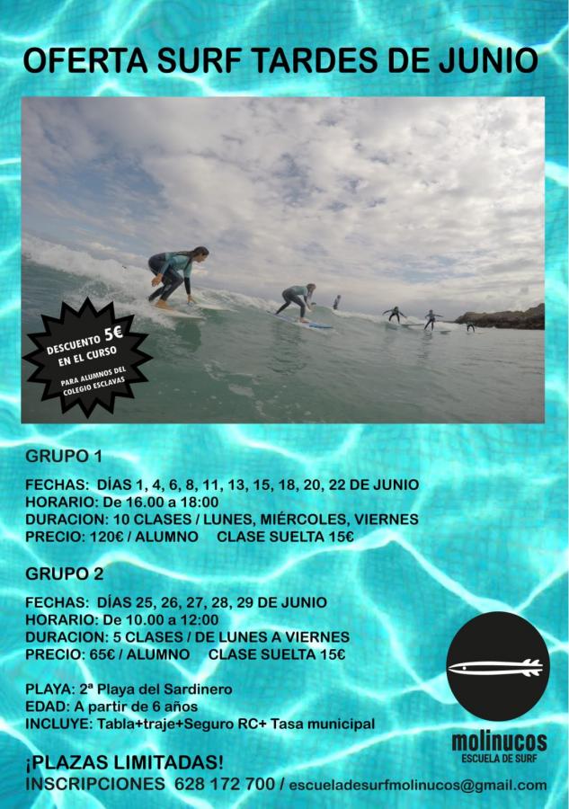 Descuento especial para alumnos del colegio en cursos de surf La escuela de surf Molinucos ofrece a los alumnos del colegio un descuento de cinco euros en el curso de las tardes de junio. Leer más sobre Descuento especial para alumnos del colegio en cursos de surf