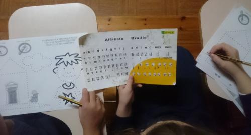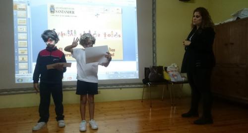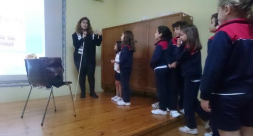 Hola chicos, soy Di+. Hoy he estado con mis compañeros de 3º de Primaria en una charla sobre personas con discapacidad. Hemos aprendido un montón de cosas nuevas gracias a que Eva Flor nos ha explicado las diferentes discapacidades que hay y nos ha dado consejos para ayudarles. Nos ha dejado claro que aunque tengan discapacidades físicas pueden tener grandes capacidades intelectuales o sensoriales y viceversa. También nos habló de que nosotros podemos tener discapacidades temporales, por ejemplo, cuando nos rompemos una pierna o una brazo. Después hicimos juegos para ponernos en la piel de las personas ciegas e hicimos actividades en unas hojas que nos repartió.